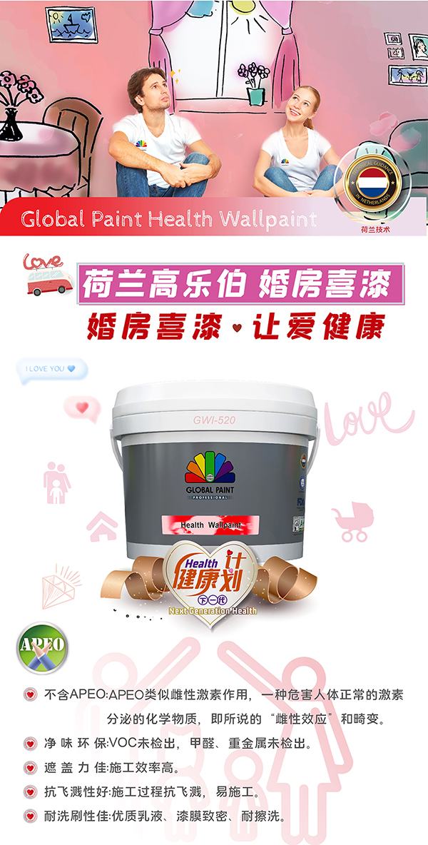 高樂(lè)伯婚房喜漆采用先進(jìn)的環(huán)??萍既橐号浞剑瑖?yán)選優(yōu)質(zhì)原材料,不含APEO(壬基酚聚氧乙烯醚,這是一種已被證實(shí)會(huì)影響動(dòng)物和人體生殖系統(tǒng)的助劑)。為愛(ài)妻人士提供一款全方位的婚房用愛(ài)漆,特別適合新婚家庭,打造一個(gè)安全無(wú)憂的居住環(huán)境,為孕婦和小寶貝的健康保駕護(hù)航。