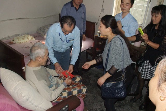 重陽節(jié)當天,鎮(zhèn)黨委朱書記、社區(qū)委員和上海大寶管理部簡侑仕經(jīng)理、工程部林心旺顧問等一同前往當?shù)鼐蠢显海赐繂柫岁懡ㄓ?、陳伯民?位孤寡老人。他們當中,年齡最大的近90歲高齡,最小的也有70多歲,因為無兒無女無所依靠,這些老人生活較為清苦,他們需要社會給予更多的關(guān)愛。