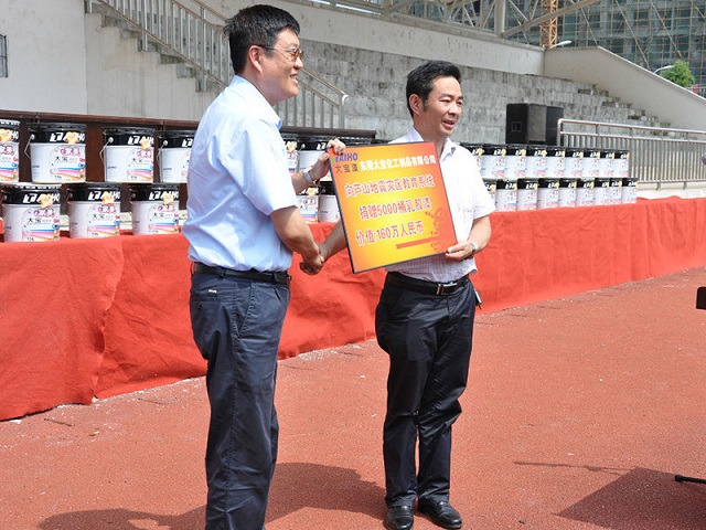 2013年6月28日上午,一場傳遞正能量的捐贈活動在四川省雅安市蘆山中學(xué)的操場上舉行,東莞大寶化工制品有限公司向蘆山地震災(zāi)區(qū)的教育系統(tǒng)捐贈了5000桶環(huán)保油漆,總價值160萬元。陳春華總經(jīng)理、葉子琛執(zhí)行經(jīng)理等領(lǐng)導(dǎo)出席儀式,蘆山縣教育局局長朱文華作為代表接受捐贈。
