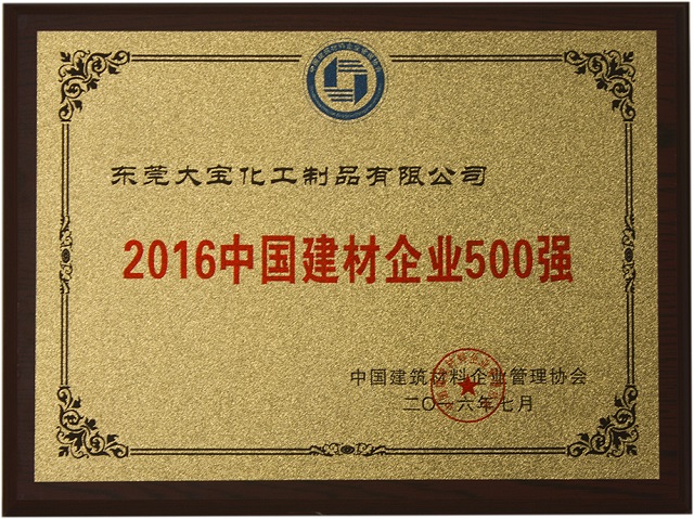 東莞大寶化工制品有限公司在中國建筑企業(yè)管理協(xié)會、中央國情調(diào)查委員會及焦點(diǎn)中國網(wǎng)的聯(lián)合評測中,榮獲“2016年中國建筑企業(yè)500強(qiáng)”榮譽(yù)獎項(xiàng)。