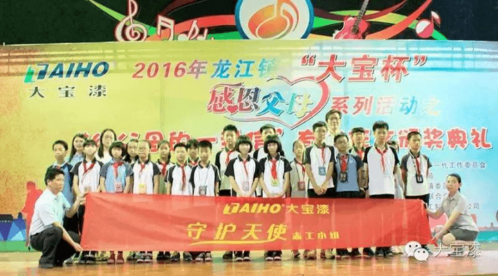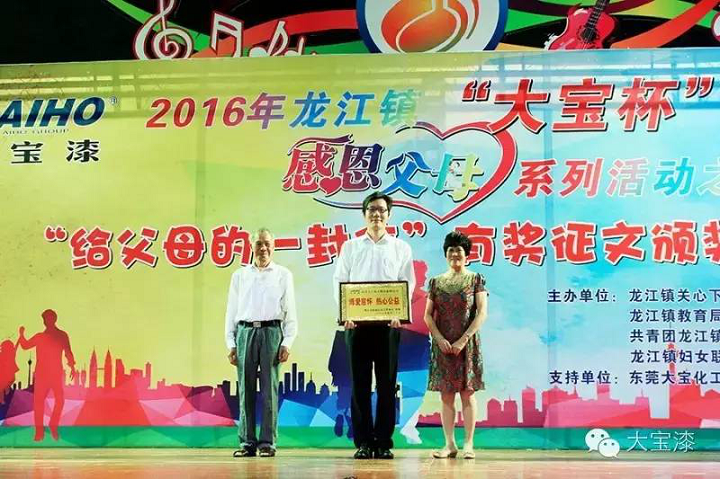 5月20日,由佛山龍江鎮(zhèn)教育局、龍江鎮(zhèn)關心下一代委員會與大寶漆共同主辦的2016年龍江鎮(zhèn)“大寶杯”感恩父母系列活動之“給父母的一封信”有獎征文頒獎典禮在龍江鎮(zhèn)城區(qū)中心小學舉辦。佛山龍江鎮(zhèn)教育局和龍江鎮(zhèn)關心下一代委員會在頒獎典禮上授予大寶漆“博愛慈懷熱心公益”稱號。大寶化工企劃部楊忠榮副理、龍江鎮(zhèn)關心下一代工作委員會麥煥橋主任、獲獎小學生及其家長出席了本次頒獎典禮。