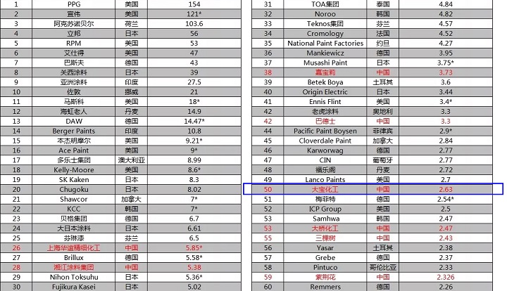 近日,美國《涂料世界》(Coatings World)雜志發(fā)布了2019年全球頂級涂料制造企業(yè)排行榜。本次上榜共82家公司,入圍門檻為2018年銷售額超過1億美元。榜單是基于涂料業(yè)務(wù)年銷售額(以美元計)排名。知名涂料品牌大寶漆,此次再次上榜,位列第50名。這已經(jīng)是大寶漆連續(xù)多年登上該排行榜。