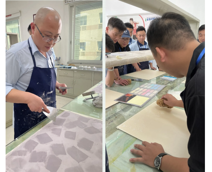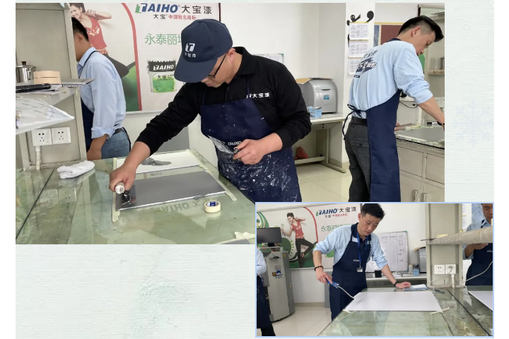 藝術(shù)涂料培訓采用理論與實踐相結(jié)合,秉承“學完即會”的宗旨,使參訓人員學會藝術(shù)涂料施工技能,掌握藝術(shù)涂料產(chǎn)品銷售技巧。培訓采用教練技術(shù)進行,即第一步:講給學員聽,第二步:做給學員看,第三步:學員做給老師看,第四步:進行指導和糾正。通過學習后,學員學會制作3D銀箔、絲綢幻彩、三色珠光、米蘭絲絨、天然彩陶砂、無機灰泥、貝殼絲絨、雅晶石、天鵝絨和2021年的新效果:清水混凝土等工藝效果。