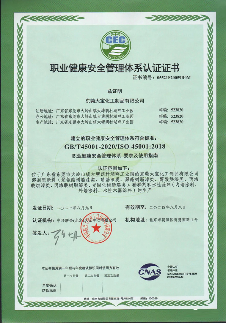 近日,大寶漆正式通過GB/T45001-2020/ISO45001:2018職業(yè)健康安全管理體系認(rèn)證,意味著大寶漆獲得國(guó)際權(quán)威機(jī)構(gòu)認(rèn)可,將為公司后續(xù)的安全穩(wěn)定與可持續(xù)的長(zhǎng)遠(yuǎn)發(fā)展提供強(qiáng)有力的保障。