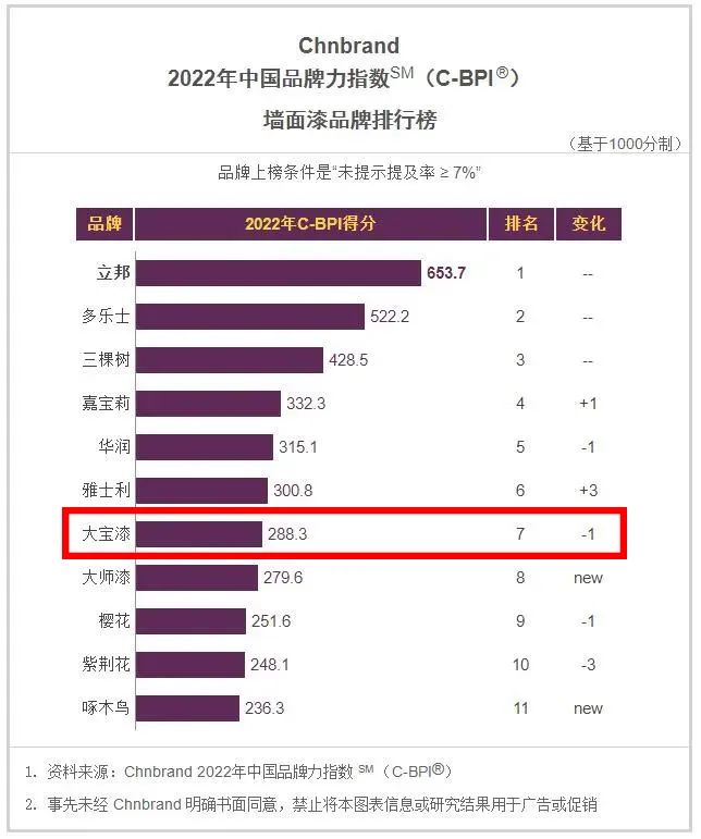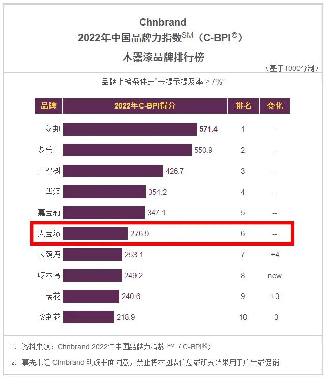 4月20日,品牌評(píng)級(jí)權(quán)威機(jī)構(gòu)Chnbrand發(fā)布2022年(第十二屆)中國(guó)品牌力指數(shù)SM(C-BPI®)品牌排名和分析報(bào)告,大寶漆再次憑借優(yōu)質(zhì)、環(huán)保的產(chǎn)品與深厚的研發(fā)實(shí)力和口碑上榜。