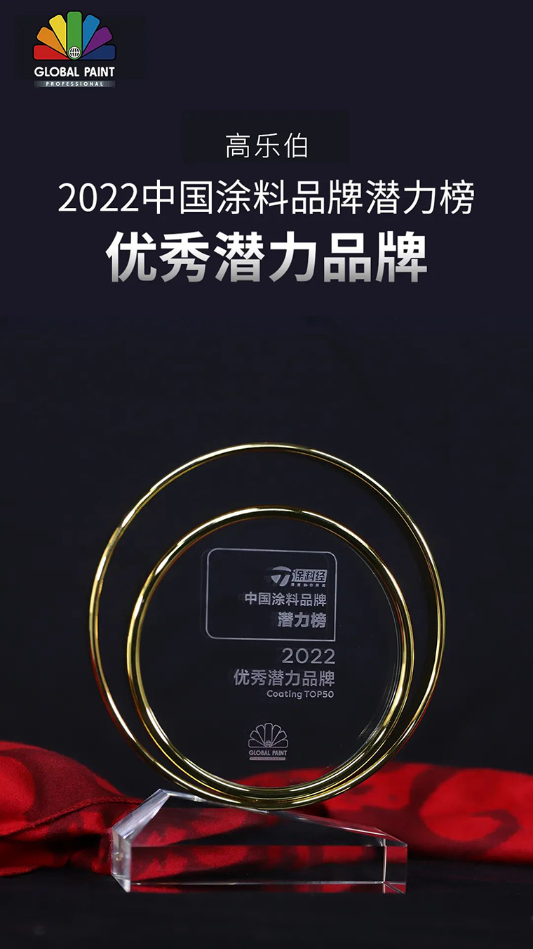 歷經(jīng)層層評(píng)審,高樂(lè)伯憑借著過(guò)硬的品牌實(shí)力和優(yōu)秀的產(chǎn)品質(zhì)量,從眾多涂料品牌中脫穎而出,被評(píng)為“2022優(yōu)秀潛力品牌”!