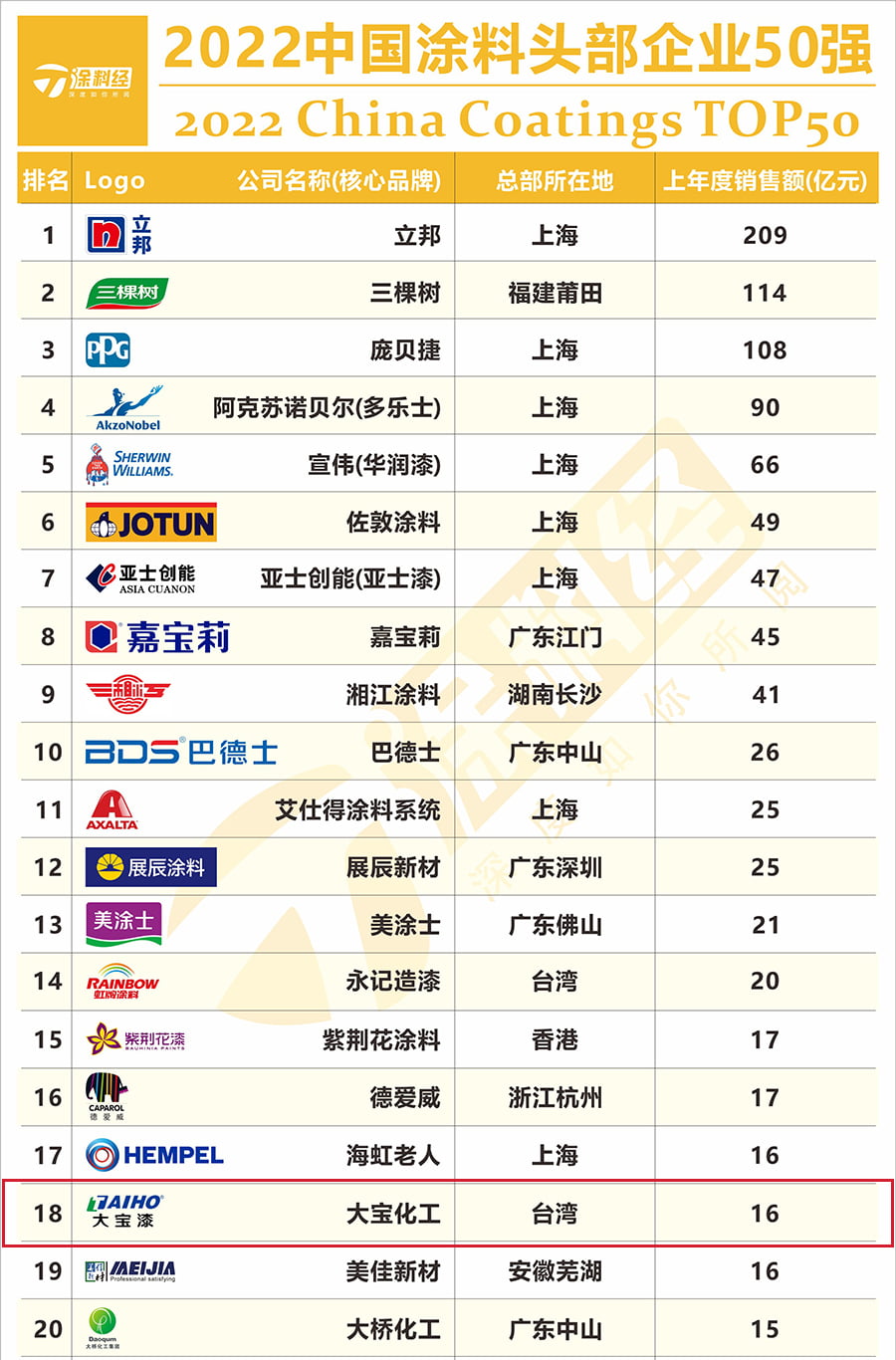 “2022中國涂料頭部企業(yè)50強”榜單的排名是依據上一年度銷售額?!爸袊苛掀髽I(yè)”,是指在中國(包括港澳臺)涂料市場上參與競爭的所有涂料企業(yè),無論內資外資;只選取其在中國市場的銷售數據作為排行依據。