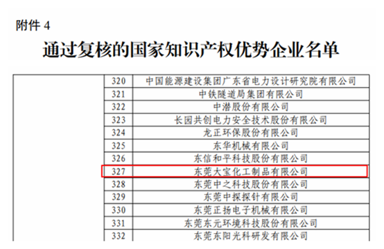 獲此殊榮的企業(yè),須能夠承接國(guó)家重大、重點(diǎn)產(chǎn)業(yè)發(fā)展項(xiàng)目,具備自主知識(shí)產(chǎn)權(quán)能力,通過(guò)積極開(kāi)展知識(shí)產(chǎn)權(quán)保護(hù)和運(yùn)用,建立全面的知識(shí)產(chǎn)權(quán)管理制度和機(jī)制,具有知識(shí)產(chǎn)權(quán)綜合實(shí)力。東莞大寶化工制品有限公司于2019年被認(rèn)定為“國(guó)家知識(shí)產(chǎn)權(quán)優(yōu)勢(shì)企業(yè)”,本次順利通過(guò)復(fù)核,意味著大寶漆自身的科研實(shí)力、知識(shí)產(chǎn)權(quán)建設(shè)示范工作再次得到了政府和社會(huì)的高度認(rèn)可。