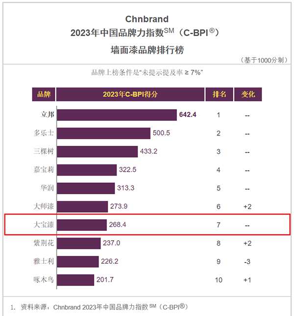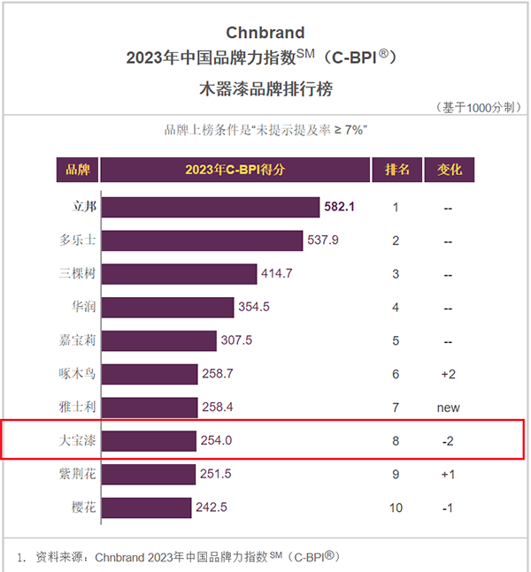 4月18日,品牌評(píng)級(jí)機(jī)構(gòu)Chnbrand發(fā)布2023年第十三屆中國品牌力指數(shù)sm(C-BPI)品牌排名,大寶漆再度上榜“墻面漆品牌排行榜”、“木器漆品牌排行榜”雙榜單,彰顯品牌影響力。
