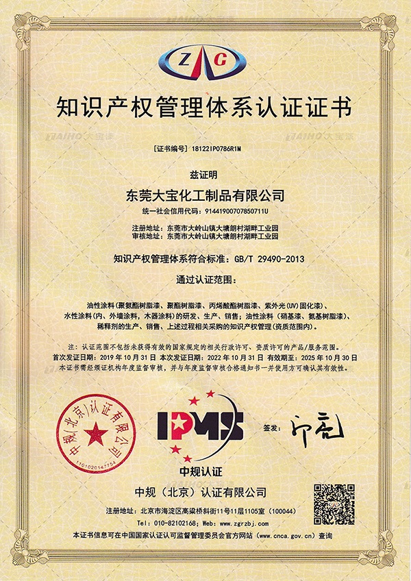 4月26日,是第23個世界知識產(chǎn)權日,大寶化工再次通過國家企業(yè)知識產(chǎn)權管理認證,是對大寶化工近年來取得創(chuàng)新成果的肯定,同時也標志著大寶漆在知識產(chǎn)權創(chuàng)造、運用、管理和保護方面具備領先水平。