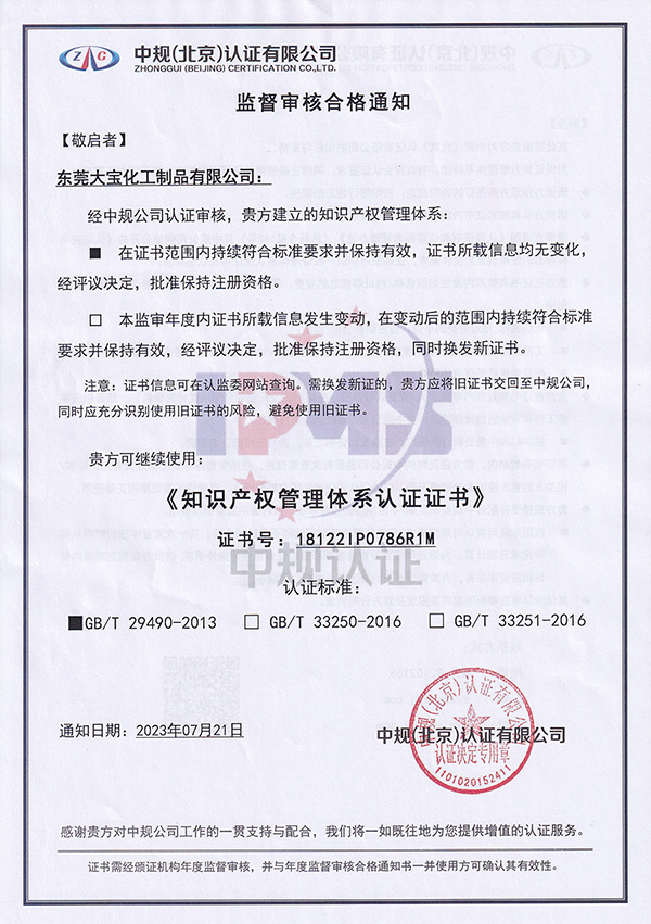 大寶化工作為國(guó)家知識(shí)產(chǎn)權(quán)優(yōu)勢(shì)企業(yè),長(zhǎng)期致力于研產(chǎn)銷(xiāo)“建筑涂料、木器涂料、金屬涂料、塑膠涂料”,得益于公司重視專(zhuān)業(yè)、創(chuàng)新的經(jīng)營(yíng)理念,致力于知識(shí)產(chǎn)權(quán)等工作的不懈努力,近期在知識(shí)產(chǎn)權(quán)工作方面取得了顯著進(jìn)展。