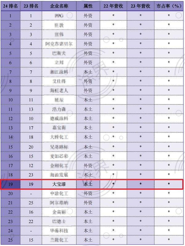 近日,國內(nèi)涂料行業(yè)專業(yè)財經(jīng)媒體《涂界》發(fā)布“2024中國工業(yè)涂料品牌25強榜單”,榜單匯聚了國內(nèi)最具影響力的工業(yè)涂料品牌。其中,大寶漆今年位列第19名,連續(xù)兩年蟬聯(lián)中國工業(yè)涂料前二十強。(數(shù)據(jù)來源:涂界)