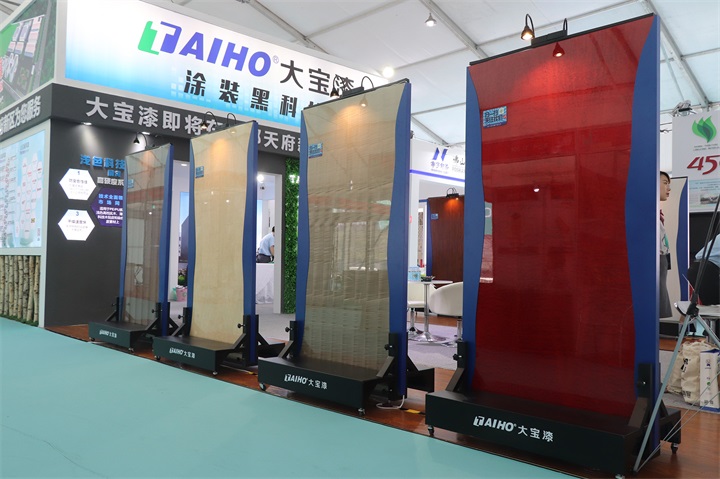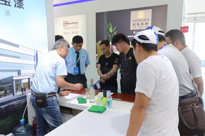 大寶漆作為國家高新技術(shù)企業(yè),緊扣“涂裝黑科技”的主題,在成都家具展重點展出了公司最近幾年研發(fā)突破的家具漆新工藝,包括:淺色科技木皮耐黃變高硬度系列、1度左右的PU全啞面漆系列、水性雙組份底面著色耐高溫系列、UV底面著色系列和格麗斯著色層次感強系列等,受到了參展的家具廠、涂料同行的關(guān)注。尤其是淺色科技木皮耐黃變高硬度系列和1度左右的PU面漆全啞涂裝系列,吸引了不少家具廠企業(yè)代表駐足觀看,了解產(chǎn)品信息,紛紛表達了合作意愿。