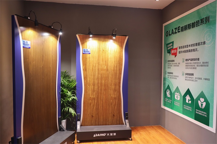 此外,還展示了大寶漆獨創(chuàng)的只需三道色+3道漆的著色工藝——”33透明涂裝系統(tǒng)”和著色后凸顯木材紋理層次的“格麗斯著色系列”。