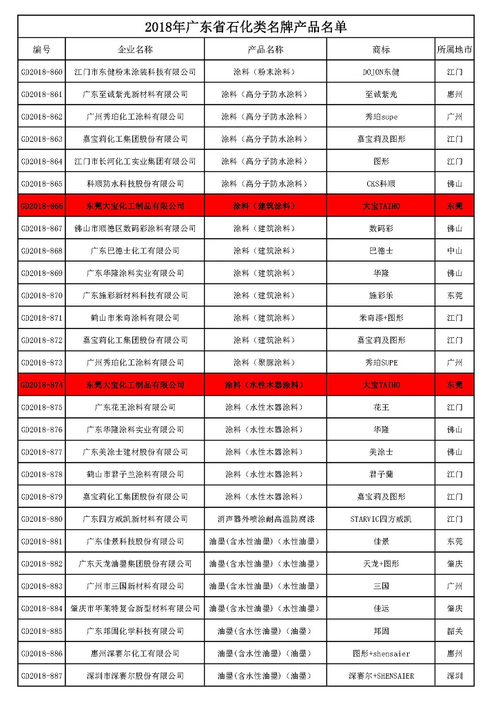 根據(jù)《廣東省名牌產(chǎn)品評(píng)價(jià)指南》標(biāo)準(zhǔn)要求,在企業(yè)自愿申報(bào)的基礎(chǔ)上,經(jīng)申報(bào)資料初審、申報(bào)數(shù)據(jù)公示、企業(yè)現(xiàn)場(chǎng)審查、專(zhuān)家綜合評(píng)價(jià)、廣東質(zhì)量品牌評(píng)審專(zhuān)家委員會(huì)審議確認(rèn),授予大寶化工生產(chǎn)的“大寶漆”牌涂料(詳見(jiàn)附件)為2018年度廣東省“石化類(lèi)名牌產(chǎn)品”。