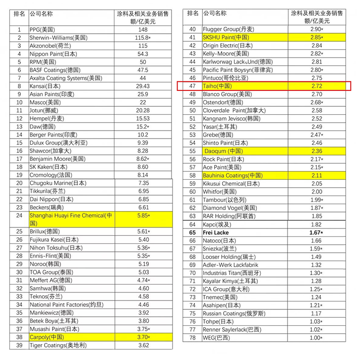 日前,美國(guó)Coatings World雜志(July 2018)最新發(fā)布2018年全球頂級(jí)涂料制造企業(yè)銷售額排行榜(前78名)(2018 Top Companies),中國(guó)6家涂料企業(yè)殺入重圍,比上年增加1家。作為中國(guó)著名涂料品牌,大寶漆連續(xù)多年登上該排行榜,此次在榜單中位列第47名,較上年提升8名。