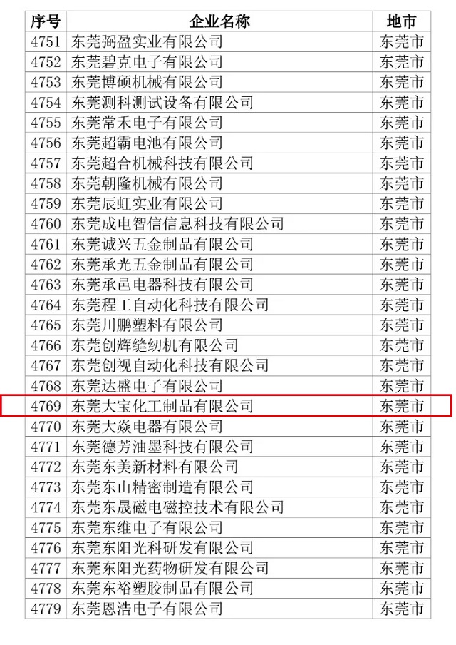 12月11日,公示的廣東省2017年第二批擬認定國家高新技術(shù)企業(yè)名單,東莞大寶化工再次通過“高新技術(shù)企業(yè)”認定,是繼2011年被認定為高新技術(shù)企業(yè)后第三次通過認定。它不僅標(biāo)志著大寶化工的研發(fā)創(chuàng)新工作邁上新的臺階,也表明大寶化工的自主研發(fā)能力和創(chuàng)新能力均在涂料行業(yè)中處于前列!