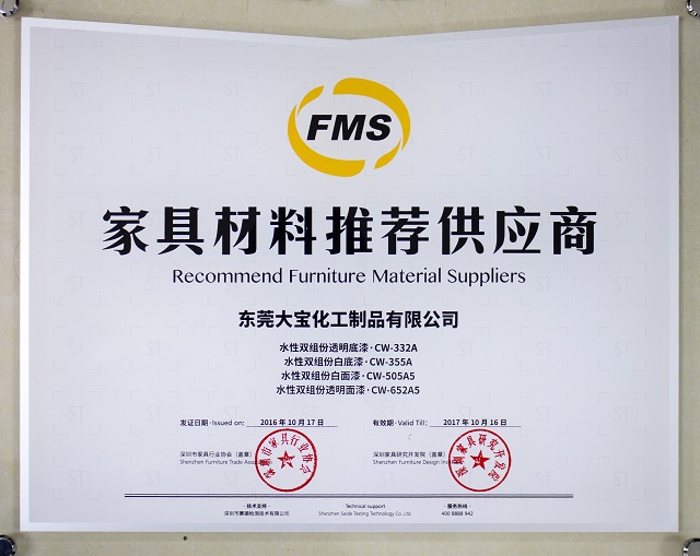 10月28日,2016深圳家具行業(yè)協(xié)會第八屆理事會第一次會員大會舉行。會上,由深圳市家具行業(yè)協(xié)會、深圳家具研究開發(fā)院聯(lián)合發(fā)起的“家具材料推薦供應商”證書頒發(fā)儀式同期進行。大寶漆憑借嚴苛的品質把控、綠色環(huán)保的涂料產(chǎn)品,獲得本年度原材料企業(yè)“推薦供應商”的榮譽。