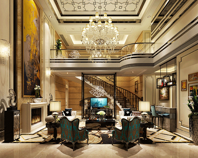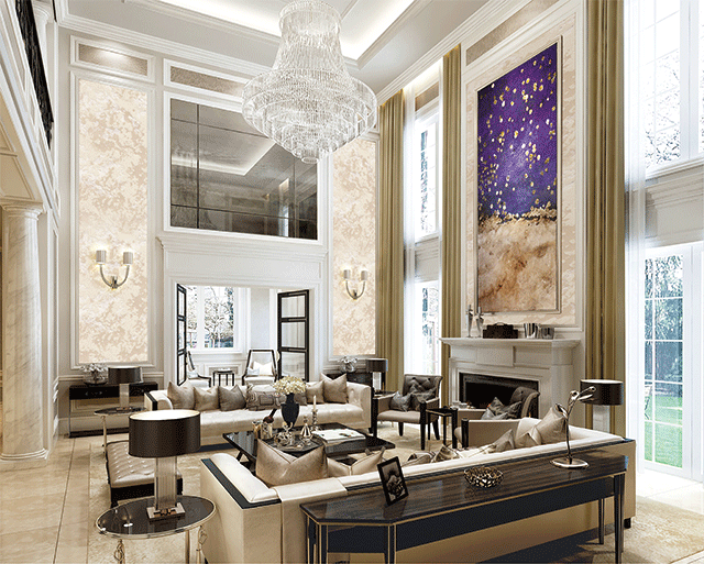 歐式客廳頂部喜用大型燈池,并用華麗的枝形吊燈營(yíng)造氣氛。門窗上半部多做成圓弧形,并用帶有花紋的石膏線勾邊。室內(nèi)有真正的壁爐或假壁爐造型。墻面一般使用高檔藝術(shù)壁材,或優(yōu)質(zhì)環(huán)保的藝術(shù)涂料,如造型多樣的大寶L’opera樓貝進(jìn)口藝術(shù)涂料,來(lái)烘托豪華效果。
