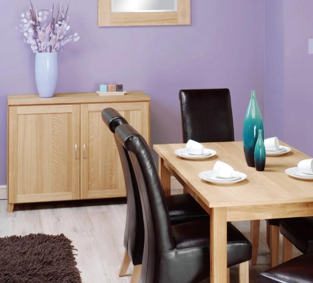 以紫色為餐廳的主色調(diào),搭配原木色餐桌和柜子、黑色椅子,并配以同色系花束點(diǎn)綴,拉大與墻面背景色的差異,使整體空間具有立體感。